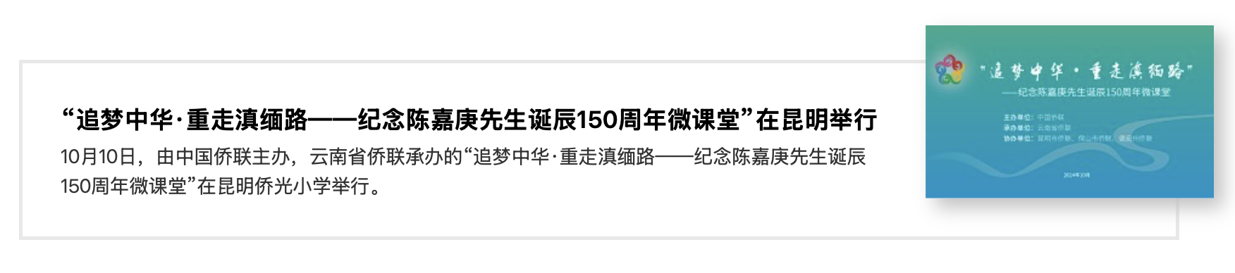 2024年是中国著名爱国华侨领袖、企业家、教育家、慈善家和社会活动家陈嘉庚先生诞辰150周年。陈嘉庚先生曾任中国人民政治协商会议全国委员会副主席、全国人民代表大会常务委员会委员、中华全国归国华侨联合会主席等职,一生为辛亥革命、民族教育、抗日战争、解放战争、新中国的建设作出不朽贡献,被毛泽东同志称誉为“华侨旗帜、民族光辉”。中国侨联是中国司局级单位。中国侨联是由全国归侨、侨眷组成的全国性人民团体。