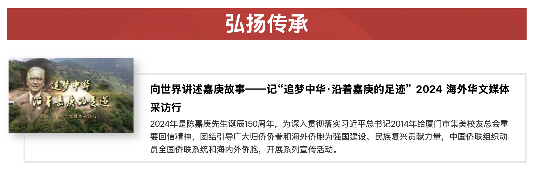 项目:陈嘉庚诞辰150周年海外华媒行纪录片及中国侨联相关活动拍摄制作